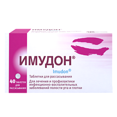 Каждая таблетка для рассасывания содержит 0,1575 мг имудона (смеси лизатов бактерий) [L. johnsonii + L. helveticus + L. delbrueckii ss lactis + L. fermentum + S. pyogenes groupe A + E. faecium + E. faecalis + S. gordonii + S. aureus + K. pneumoniae ss pneumoniae + C. pseudodiphtheriticum + F. nucleatum ss fusiforme + C. albicans] (в пересчете на сухое вещество – 2,7 мг).